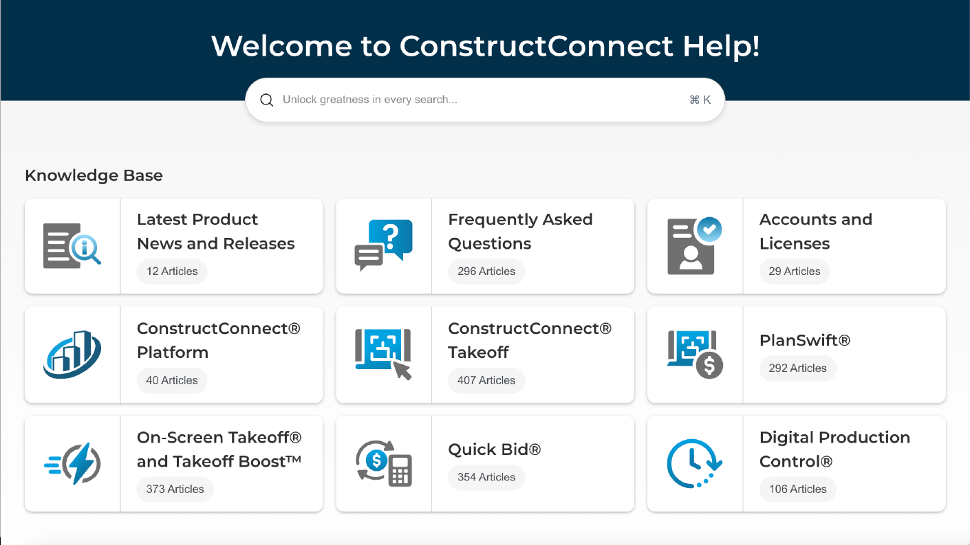 We’re excited to introduce the brand new ConstructConnect assist system! Designed to make discovering solutions simpler and quicker, this upgraded system is filled with instruments that will help you get essentially the most out of our merchandise. Whether or not you’re on the lookout for consumer guides, FAQs, coaching supplies, or the newest information, this new replace has every thing you want in a single place.