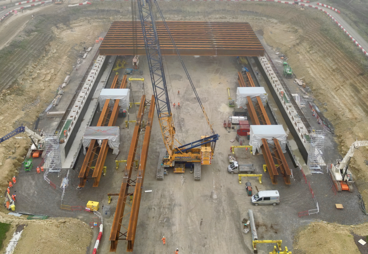 The beams weigh as much as 105 tonnes and are being lifted in pairs. They’ll help a concrete deck shaped of pre-cast slabs which can help 2,700 cubic metres of earth to finish the landscaping.